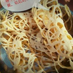 7. Brush a thin layer of oil into the pot, first Warm up for one minute.(●´ϖ`●) Then cut a small opening at the bottom of the bag containing the egg liquid, and draw pictures in the pot in a circular motion.When the cake is loose and removable, flip it over and fry for 30 seconds, then roll it up with chopsticks.|ω・)و ̑̑༉