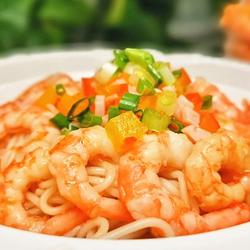 7. Place Arctic shrimp on the cooked noodles and drizzle with shrimp oil On the surface, mix well.