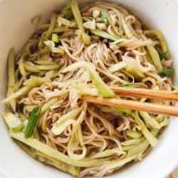 2. While cooking noodles, prepare shredded cucumber, minced garlic, and shredded green onion.