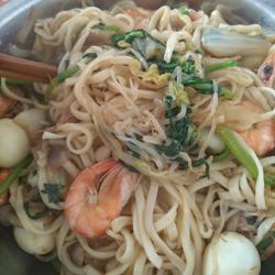 Pour in the oil when it is hot Add mushrooms, then add baby cabbage and chrysanthemum! Bean sprouts! Quail eggs, prawns! Add the cooked noodles at the end!