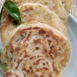 2. Cut the dough into approximately the same size, roll it into a round piece, and apply cooking oil on the crust.Sprinkle with salt and chopped green onion.