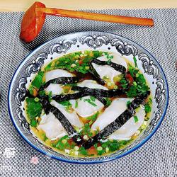 14. After the wontons are stewed, put them into a large bowl and pour a small amount of soup., a bowl of delicious seaweed and three fresh wonton stew is served.