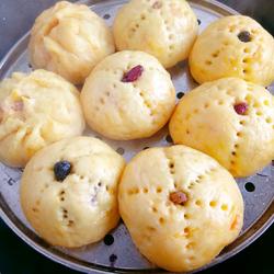 4. Wrap the purple potato filling, brush the basket with oil, pierce the eyes with a fork, and add raisins, dried cranberries, and dried black currants , made into small pumpkins