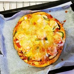4. Take out the dough, let it rise at room temperature for 20 minutes, roll it into a ball, this time it is OK Make a plate of bread, roll it with ham and cheese filling, then ferment the pizza for 25 minutes, heat the oven to 30 degrees, and use two bowls of hot water at the base of the oven.Let it rise to 1.5 times in size, brush with a layer of pizza sauce, sprinkle with grated cheese, place shrimps, etc., then sprinkle with cheese, preheat the oven to 180 degrees