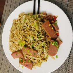 5. When the luncheon meat is a little burnt, add the noodles (if you want to add Add the bean sprouts at this time), add sea pepper dipped in water (chili sauce), stir-fry evenly, and finally sprinkle with chopped green onion and you're done!