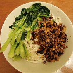 A delicious mushroom, minced pork, and vegetable noodles is ready~