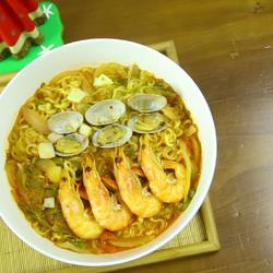 11.After boiling, add octopus, shrimp, and spicy ramen noodles, and cook for another 3-5 minutes