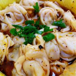 8. Add two spoons of seafood soy sauce, two spoons of vinegar, sesame seeds, and crushed peanuts to the bowl , salted dried radish, a little salt, pour wonton soup, then pour in the wonton soup when it is cooked, pour four spoons of red oil, and sprinkle with chopped green onion.