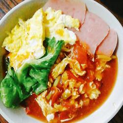7. Take out an appropriate amount of noodles and pour the fried tomatoes and eggs on the noodles.Put a few slices of ham, then put the remaining scrambled eggs on the surface, and add some green leaves randomly to add color to the food.