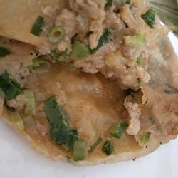 5. Put more noodles on the panel to avoid sticking to your hands (I didn’t take pictures of the steps, sorry), use chopsticks to take a piece of batter, Put the meat filling in the flour on the panel and press it flat, put a little oil in the pot, put the meat patty and press it flat to bake
