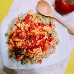 5. Add half a spoonful of high-concentration white wine, white beard powder and appropriate amount of salt to the egg liquid, stir well, and use bran rice oil Scramble the eggs until there is still a small amount of egg liquid and set aside.Then cook the tomatoes, leaving a small part of the tomatoes.When the tomatoes are cooked, add the remaining tomatoes and 3 tablespoons of ketchup and cook for 2 minutes, then add the scrambled eggs, Add a little mushroom powder and salt and cook for 2 minutes;