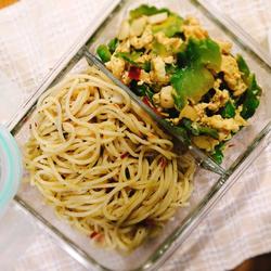 5. Heat the pan with butter and add the spaghetti and stir-fry.Yes, then add rosemary, coriander, black pepper and chopped pepper, stir-fry well, and put it into a lunch box;