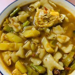 5. Use a rolling pin to roll the dough into a relatively thin dough, about 2- 3mm, and then cut the dough into multiple dough pieces; at this time, stir-fry the ingredients in a wok, add dark soy sauce, salt and other condiments, stir-fry for a few minutes, then add water and boil.At this time, start to pull the pieces.Take the dough piece with your left hand, use your index finger and thumb with your right hand to pull it into a size about the size of a fingernail and put it into the pot.At this time, you can crack two poached eggs and go, it will have a unique flavor!