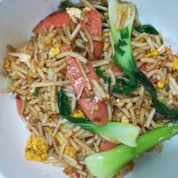 3. Heat the pot, add an appropriate amount of oil, heat the oil, and break in two eggs or meat Shred the meat (depending on the individual), break it into pieces with a spatula, stir-fry, then add green vegetables, ham sausage, green onion, stir-fry,
