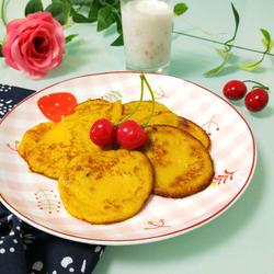 6.Use a non-stick pan, put oil in a low heat and heat it slightly, pour in the pumpkin paste, and adjust it to your own size Set, make it smaller and easier to flip over, fry until solid and flip over