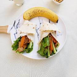 6. Then spread the washed lettuce, add chicken, onions, carrots and cucumber strips.Then squeeze an appropriate amount of Thai sweet and spicy sauce and roll it up