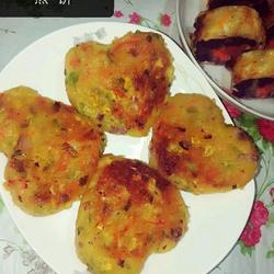 4.Mash the potatoes together with the seasonings, shape them into the shape you want, fry them in the pan until golden brown, as shown in the picture,,,,