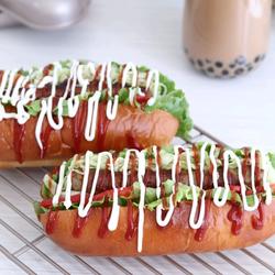 4. Shred the cabbage, slice the tomatoes, and fry the sausage until fragrant.Cut the bread in half from the top without cutting it, squeeze in the salad dressing, put lettuce, tomatoes, sausages, shredded cabbage, then squeeze on the tomato sauce and salad dressing.