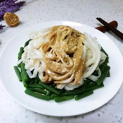 5. First put the beans on the bottom layer, put the noodles on top, pour the sesame sauce and sprinkle with white Just sesame seeds.