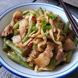 1. Prepare the main ingredients: fresh noodles, washed beans and cut into sections, green onion, ginger, garlic, and pork belly cut into small pieces.