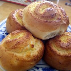 3.From top to Roll up and cut into sections, with the cross section facing up, put it in the oven for secondary fermentation at 40 degrees for 40 minutes, brush the surface with egg wash, and bake in the oven at 180 degrees for 20 minutes