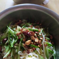6.Cooked noodles.Cool water.Place in a basin.Add your favorite cucumber shreds and peanuts, then add some soy sauce, light soy sauce, and sesame oil.Mix well.Edible.very delicious.