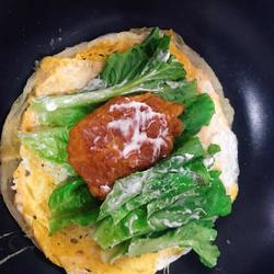 7.Put the egg side on top, add the fried chicken tenders, add lettuce and spread salad dressing