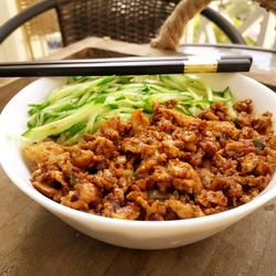 14.Put on shredded green onion, shredded cucumber, and add fried sauce