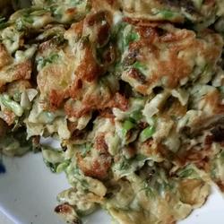 4.The fourth step is to heat the pot and add oil to spread evenly on the bottom of the pot, then use a spoon to Pour the sophora flower paste into the pot and spread evenly until both sides are golden brown.Remove from the pot and serve on a plate!