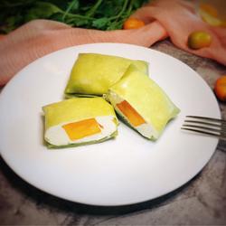 15.Take a piece of pie crust, with the wrong side facing up, first put 1 spoon of cream, and then 1 piece of mango, and finally cover with 1 spoon of cream.