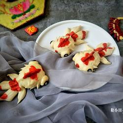 14. Stick a small amount of water on the Oreo dough and stick it on the main body of the goldfish eye dough, and take a mung bean.Make a round ball of red yeast rice flour dough, stick a toothpick with a small amount of water on the goldfish's mouth.