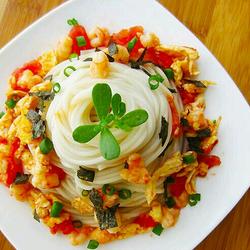 8. Cut the seaweed into small pieces and spread it on the bottom of the plate.Place the cooked noodles On top of the seaweed