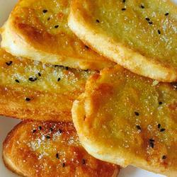 4. Roll the steamed bun slices in the eggs, take them out and fry them in oil until both sides are golden