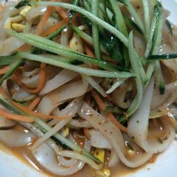 6. After the cold skin is done, cut it into strips and add your favorite side dishes (I added shredded cucumber, Shredded radish, soybean sprouts), add seasonings and you’re ready to eat.