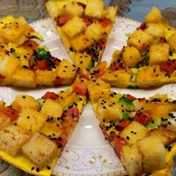 7.Pour the beaten eggs evenly on top with a slotted spoon