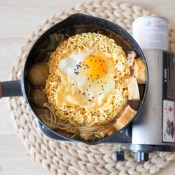 Bottom of the pot Pour in Han's chili sauce and spread all the ingredients in order (except bread, eggs, cheese).