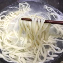 7.Use a knife to cut into uniform long strips (I cut a dozen strips first and then stretched them.Cut it after finishing), gently use both hands to stretch the two ends to the left and right, and bounce them up and down at the same time.The center point of the noodles hits the panel.Repeat the stretch and bounce several times until you are satisfied with the thickness, and then immediately throw it into the pot ( You can also imagine how the chef of Lanzhou Ramen Restaurant stretches it).Just repeat the operation one by one.I usually finish one noodle, cook the noodles and put them into a bowl, then cut the second noodle, and then the third noodle.After cooking one noodle, you can add an appropriate amount of cold water and cook the second noodle.
