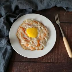 5. Add an appropriate amount of oil to the pan, heat it and add the carrot and potato shreds that are evenly stirred, in the middle Dig a hole and break in an egg yolk