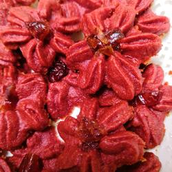 3.Purple sweet potato starch can make the cookies turn beautiful pink after baking.I don’t have any purple sweet potato starch at home, so I used red yeast rice powder instead.Food coloring is also possible, but natural food coloring is safer.