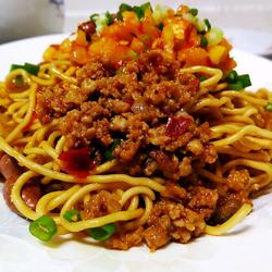 3. Take a pot and boil water , after the water boils, blanch the oiled noodles in boiling water for ten seconds, take them out and put them in a basin, add the prepared ingredients, mix well and place on a plate before eating