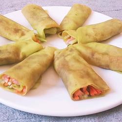 15. Spread the sweet flour sauce, add shredded ham, carrots and cucumbers, and roll it up.