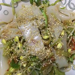 7. Add sugar, vinegar, light soy sauce, fresh vegetables, bean sprouts, cucumber, chili sauce, and mix well.