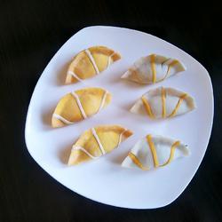 4.Put 1 yellow noodle in the middle of the dumpling wrapper, and put another noodle in the middle of the dumpling skin.Form a cross in the middle, place another piece of dough at the center of the cross (as shown in the picture), press it gently with a rolling pin, and cut off the excess noodles.