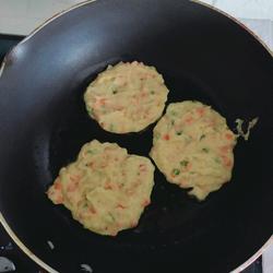 4. Turn on the heat and serve.Pour in appropriate amount of oil.Shape the stirred mashed potatoes into small cakes and put them in the pot.Fry until both sides are golden brown.