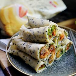 1. Such as The breakfast cake pictured here uses 200 grams of pastry wheat flour, 400 grams of water, 2 eggs, 1 lettuce, marinated pork belly with barbecue powder, and an appropriate amount of black sesame seeds