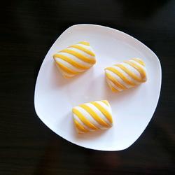 1.Pour flour, yeast powder, and coconut powder into a basin and mix evenly into two parts.Add pumpkin puree to one part and form a yellow dough., add another portion with warm water and knead into a dough, let it rest for 10 minutes, knead and deflate the rested dough, and divide it into two large and small pieces.