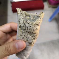 5. Pour oil into the bottom of the pot, heat it slightly, turn on medium heat, spoon a spoonful of soybean dregs milk in Make the bottom of the pot as thin as possible, turn on medium-low heat, cover and simmer for one minute, the cake will expand and become soft.