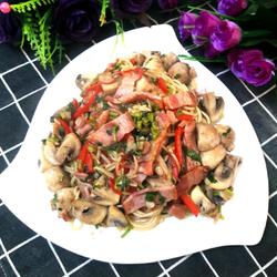 7. Saute the mushrooms until fragrant, add diced bacon, minced garlic oil, and mix together stir fry.