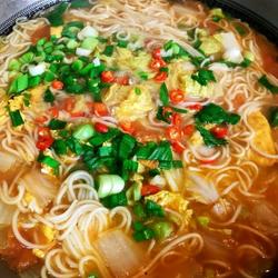 4.Finally, when the noodles are cooked, add green onion and chili rings, and the steaming western red egg noodles are ready to be cooked.
