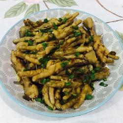 6. Pour in the chicken feet and stir-fry evenly, then add salt, light soy sauce, and old Smoke, sugar, and stir-fry until fragrant.